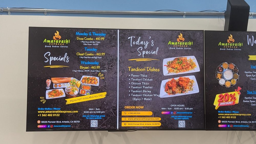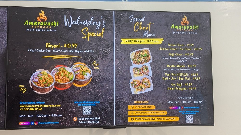 Introducing the menu at Amaravathi Express, a dessert and fast food spot in Artesia, CA, where the focus is on delivering authentic South Indian flavors. Customers rave about the friendly and attentive staff, clean ambiance, and generous portions. Dishes like Chicken dum biryani, Apollo fish fry, Andhra chicken curry, and dosas receive high praise for their delicious and flavorful profiles. The restaurant offers a wide selection of dosas, but some reviews note an excess of oil in certain dishes. Despite some minor issues with takeout packaging, the overall experience at Amaravathi Express is marked by exceptional service and mouthwatering Indian cuisine. Whether you're craving traditional favorites like paneer tikka or exploring new flavors like salt and pepper shrimp, this place comes highly recommended for a taste of India in California.